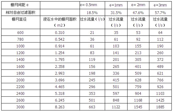 在已知過渡面積或水渠中高水平面高度W(見ROTAMAT楔形細格柵機的安裝圖紙)時,其純水過水流量可從下表中查,通過不同污水的污染系數(shù),可折算其污水的過水流量。